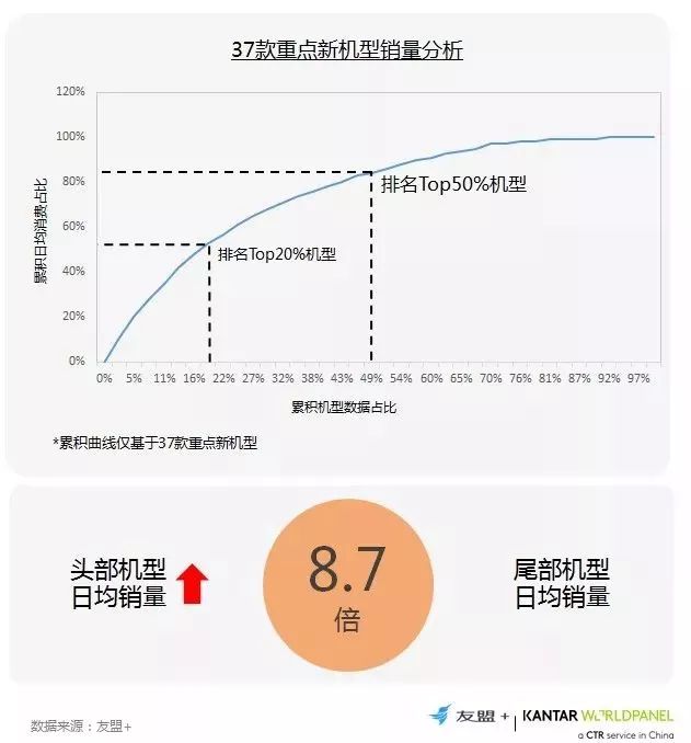 3、对比37款新机型销量分布,头部机型日均销量是尾部机型的8.7倍,且贡献近60%的新机销售占比