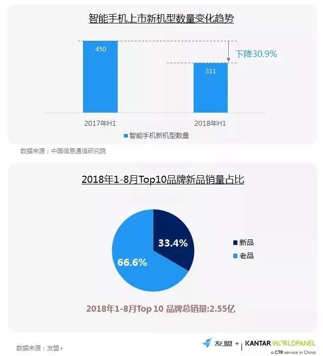 1、2018年新机发布数量减少,从Top10品牌市场表现来看,新品总体拉动了品牌方33%的业务增长