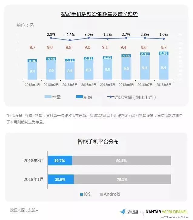 月新增设备数量徘徊在3-4千万,整体月活增幅始终低于3%;