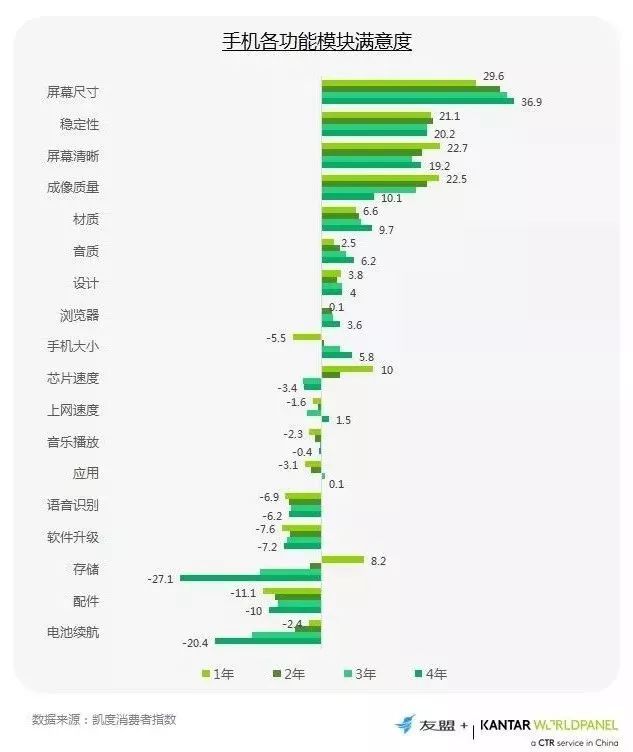 2、随使用时长的增加,用户对屏幕尺寸越发习惯,但对存储空间和电池续航能力的满意程度不断下降