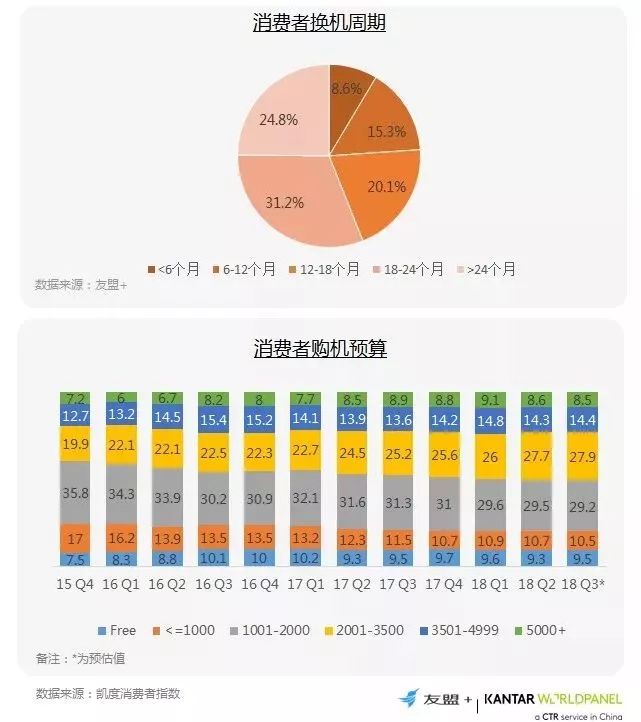 超50%用户在1-2年间产生换机行为;近80%用户会在两年内换机。且换机预算在不断提升,超50%消费者的购机预算在2000元以上