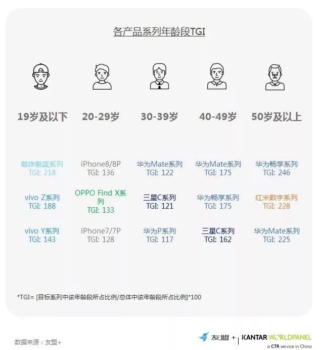 5、OV和魅族在20岁以下渗透较强;苹果、一加、锤子和魅族用户较为集中在20-29岁和30-39岁;华为用户偏成熟/年长