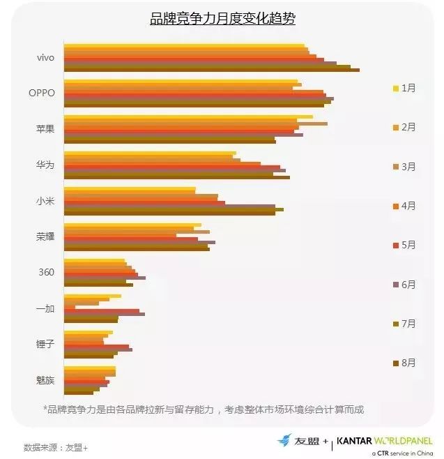 2、vivo、OPPO、苹果品牌竞争力排名第一梯队
