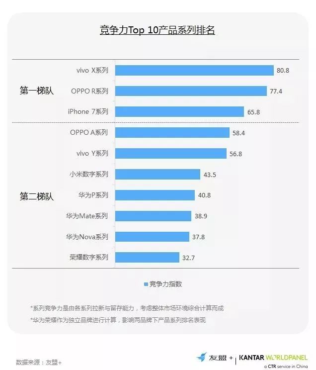 19、竞争力指数排名Top10的产品系列,均来自Top 6品牌; vivo X系列和OPPO R系列综合竞争力较强