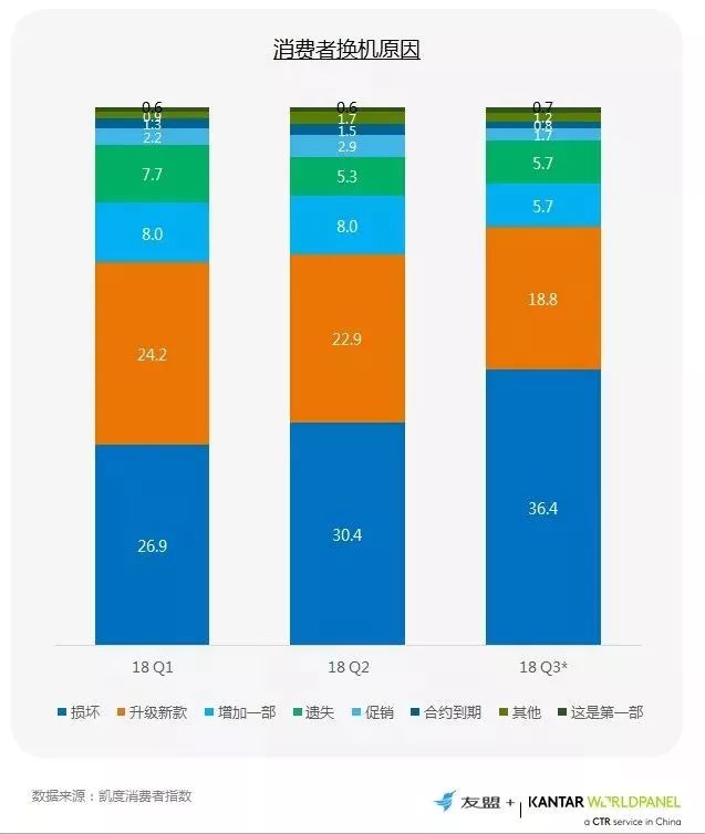 3、消费者主动升级新机的比例降低,被动换机的比例升高