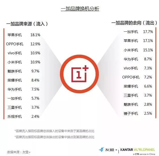 16、换机流向分析:一加品牌用户来源分散;与其他品牌相比,一加用户的换机品牌忠诚度相对较低