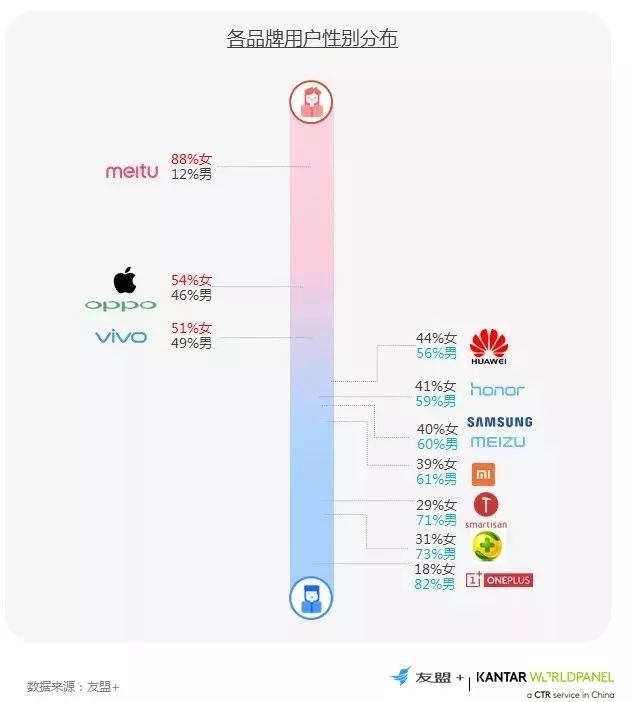 4、美图和一加是性别特征最为显著的品牌,Top10主流品牌中,苹果和OPPO品牌女性用户比例最高,互联网品牌(小米、魅族、荣耀)和三星用户都出现明显男性化