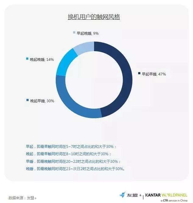 10、47%早起早睡用户的触网时间在5-7点到20-22点之间,使用手机时长跨度为15小时