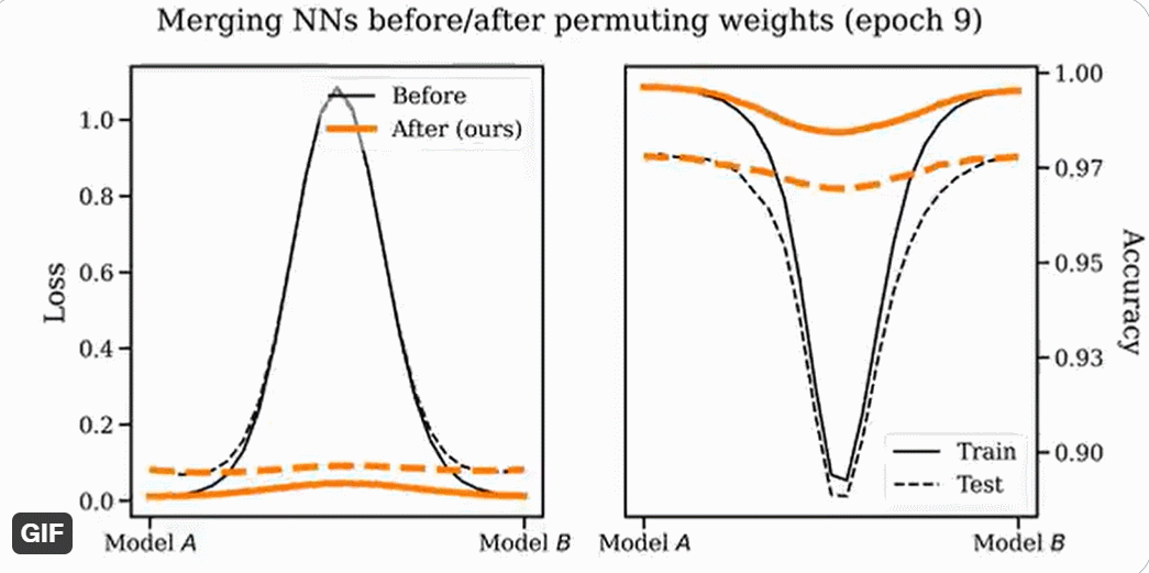 假设你训练了一个 A 模型,你的朋友训练了一个 B 模型,这两个模型训练数据可能不同。不过没关系,使用本文提出的 Git Re-Basin,你能在权值空间合并这两个模型 A+B,而不会损害损失。