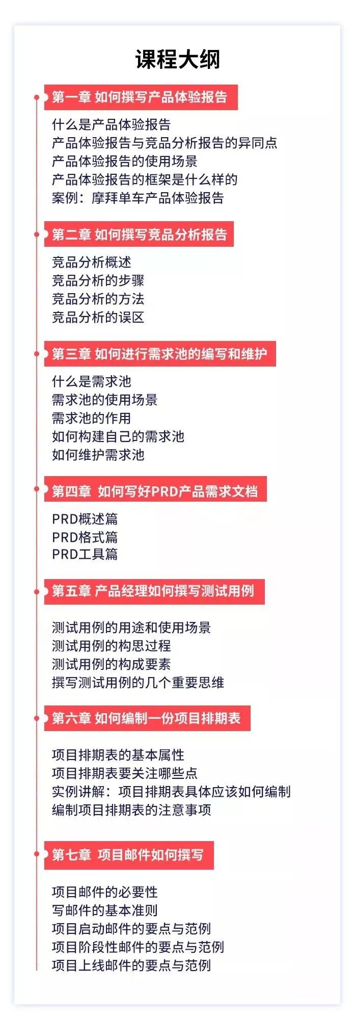 除了我们熟知的产品体验报告、竞品分析、PRD外,还教你需求池相关文档、项目排期表、项目邮件等产品经理常用、却少有相关学习资料的文档的撰写方法。