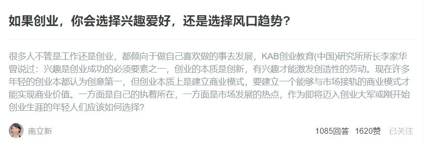 为此,11月下旬,创业邦联合中国最大的职场实名社交平台脉脉,共同发起了“如果创业,你会选择兴趣爱好,还是选择风口趋势?”的问答活动。