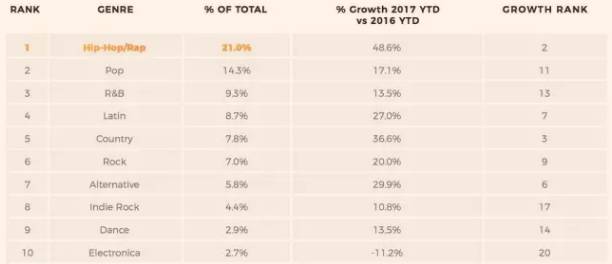 在刚出炉的BuzzAngle《2017美国年中音乐消费市场报告》中,Hip-Hop单曲和专辑的销量都是第一,已然成为最受美国民众欢迎的音乐类型。