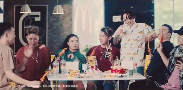 最开始是麦当劳,因为吴亦凡本来就是代言人,让他和rapper一起举着烤鸡翅膀拍小食广告,顺理成章。