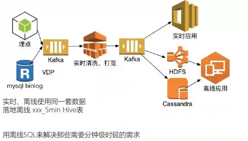我们现在来做里面的事情,能实时处理的数据就不会再去离线处理。因为实时处理的实时清洗打宽以后,我们以五分钟的粒度写入HDFS的准实时表里面,离线任务就可以启动来使用这些数据了。这样,很多数据的的口径就做到了一致性。