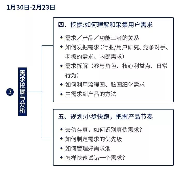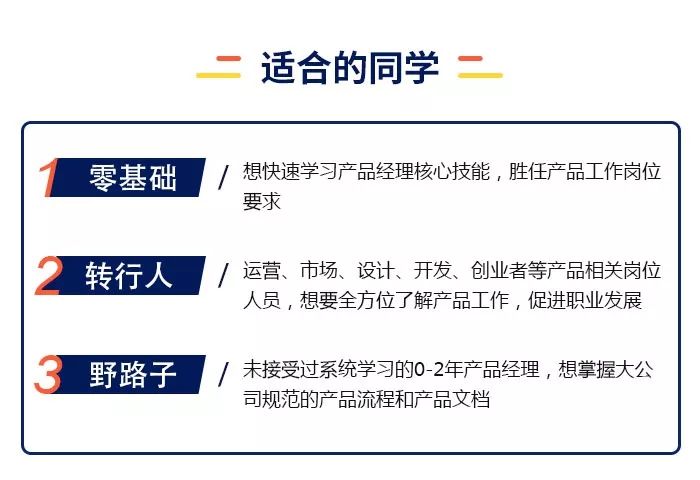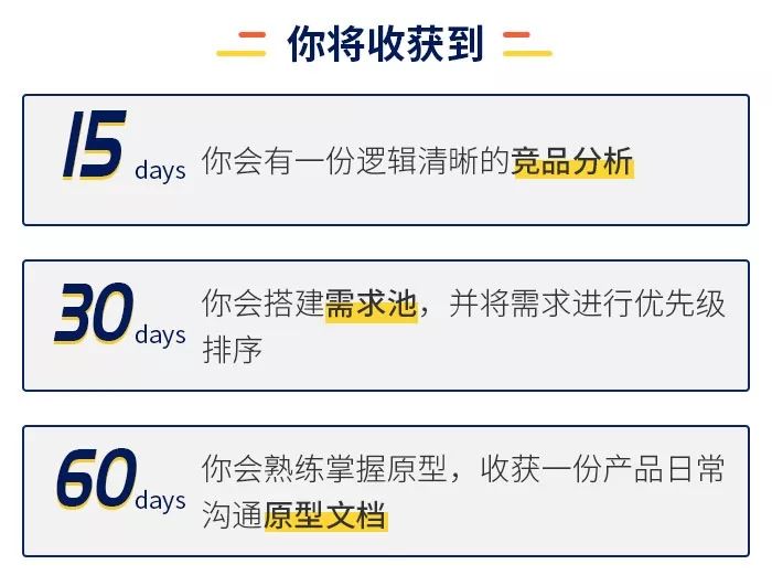 通过3个月的学习,掌握产品经理工作的全流程工作内容和工作方法。从市场分析和竞品分析,到如何进行需求挖掘、分析和管理,再到产品规划及产品设计,还有产品运营推广。帮助缺乏产品经验的同学经历一次产品迭代全流程,更快上手产品工作。