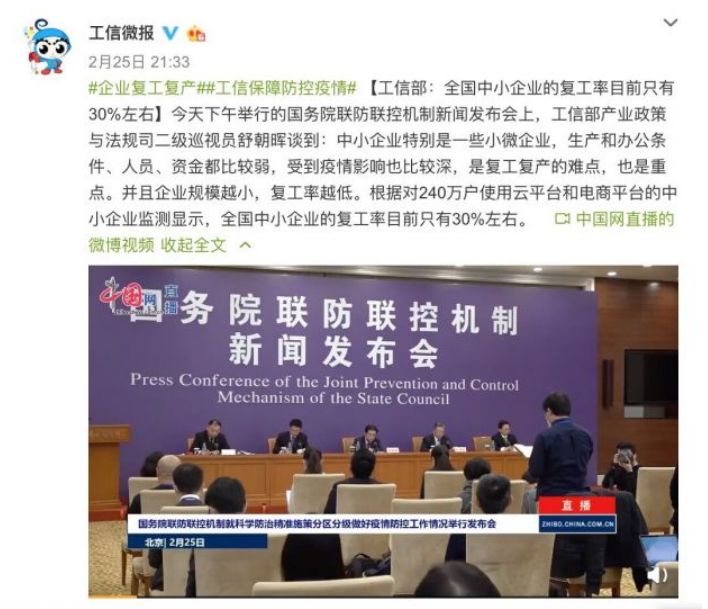 尽管根据国家发改委数据,当前全国规模以上工业企业复工率正在逐步提高,但2月21日召开的中央政治局会议依旧表示“疫情拐点尚未到来“,对于中小企业,特别是一些小微企业,受疫情影响仍然较大。工信部于2月25日发布消息称,根据对240万户使用云平台和电商平台的中小企业监测显示,全国中小企业的复工率仅30%左右,小微企业复工仍然需要直面疫情的大考。