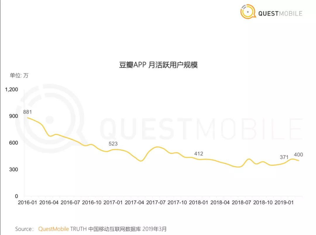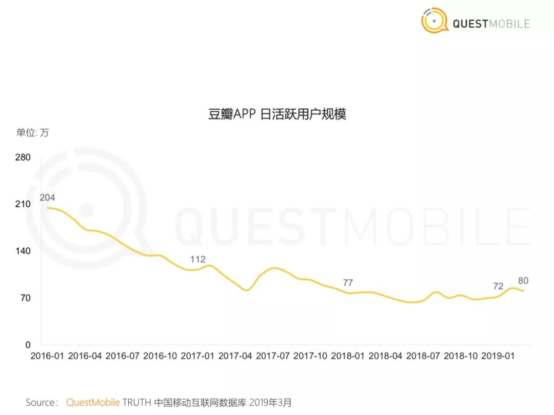 2005年,比百度贴吧晚两年的豆瓣诞生。虽然诞生日期相差两年,但两个产品的高光时刻几乎无差:2012年8月,豆瓣宣布月度覆盖独立用户数破1亿,日均PV为1.6亿。2013年第二、三季度,豆瓣月度覆盖独立用户数均达2亿,较上一年同期增长一倍。但如今,豆瓣的月活日活并不好看。QuestMobie数据显示,今年1月,豆瓣月活相比三年前几乎腰斩,降至400万左右;日活更是从204万下滑至80万。