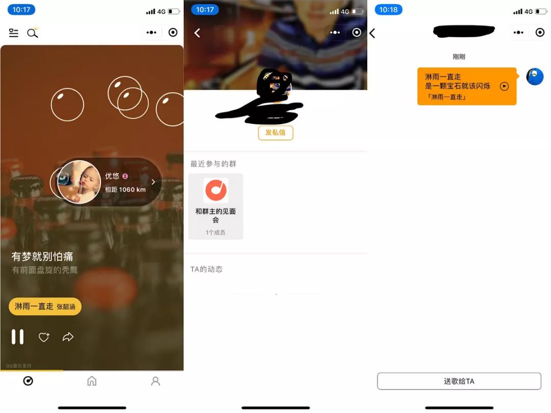 用户体验上,新一代产品更强调互动性。在和群中,用户可以看到冒着泡泡的音乐播放器页面,点击泡泡可以看到对方的头像、昵称、性别、距离,还可以给对方发送歌曲,实现交友和交流。同样在群组里,用户也可以和任何一个成员发私信,目前只限于歌曲。如果未来可以发消息,将有更多可能性(已有用户提出这一诉求)。其实在很多社区平台上,用户之间想要继续深入交流时,都不忘说一句“加个微信吧”。在即时通讯方面,这是微信相比于其他产品的优势所在。