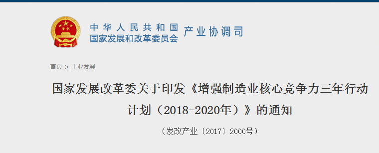据发改委11月27日消息,为加快发展先进制造业,推动互联网、大数据、人工智能和实体经济深度融合,突破制造业重点领域关键技术实现产业化,发改委制定了《增强制造业核心竞争力三年行动计划(2018-2020年)》(简称“《行动计划》”)。