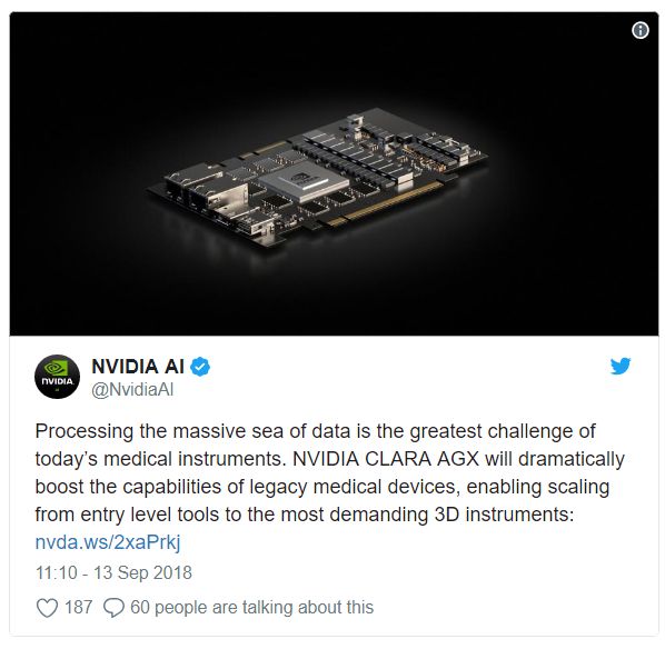 2018 年 3 月,英伟达在其 GPU 科技大会(GTC)上展示了一款医学影像超级电脑 Project Clara;9 月 13 日,英伟达 Clara 平台正式发布,这个平台将大幅度弥补传统医疗仪器在运行速度和功能上的不足,从而开创人工智能技术与医疗设备全面结合的新篇章。