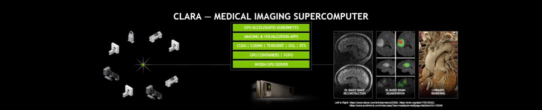 据统计,目前全球 300 万医疗影像设备每天都在产生海量的数据,但是常常受限于机器老旧,无法应用时下最新的程序或算法。Clara 平台正是为了解决老旧设备难以快速执行应用程序的问题,通过将这些仪器连接到英伟达 GPU 服务器,来提高其处理速度。比如用于 CT 和 X 光的迭代重建算法,或者用于 MRI 的压缩感知算法,都可以通过 Clara 平台在服役十年的老旧设备上运行。