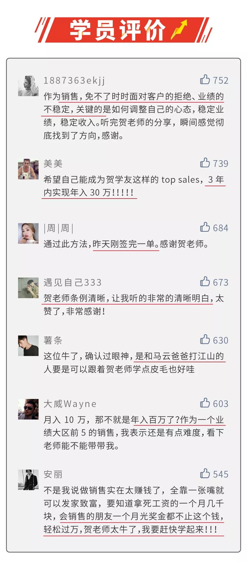 那些每个月只能拿底薪的销售,跟着老贺,也学会了这套销售方法,从只拿底薪,到月入5万、10万,一年能拿到了近百万的佣金。