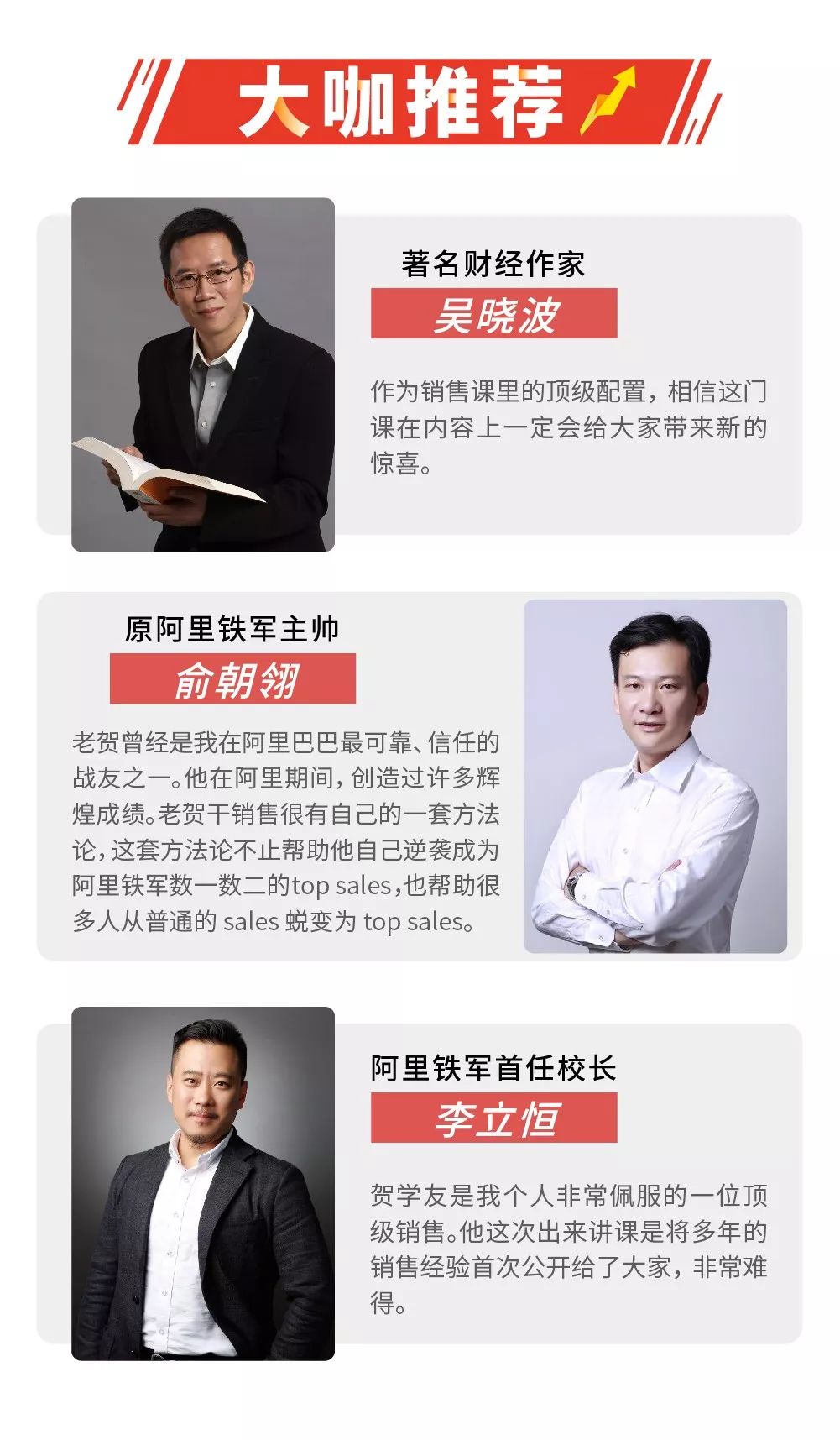 这一次的课程,贺学友向大众公开自己的销售方法。他花费一年时间,打造了《阿里全球销售冠军的——20堂进阶课》。