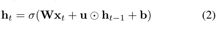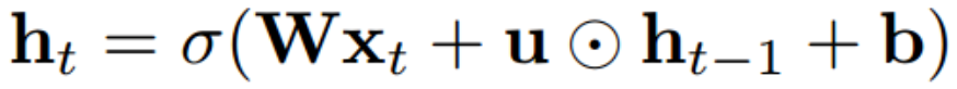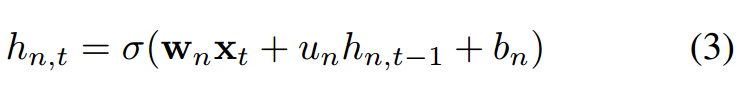 其中循环权重 u 是向量,表示 Hadamard 乘积。每一层的每个神经元各自独立,神经元之间的连接可以通过堆叠两层或更多层的 IndRNNs 来实现(见下文)。对于第 n 个神经元,隐藏状态 h_n,t 可以通过下式得出: