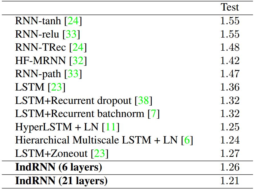 表 2:IndRNN 模型的 PTB-c 结果与文献记录结果的对比(基于 BPC)。