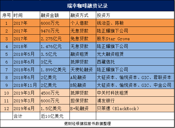 瑞幸咖啡在融资时“两条腿”走路:风险投资+抵押贷款和股东借款,累计融资近10亿美元;