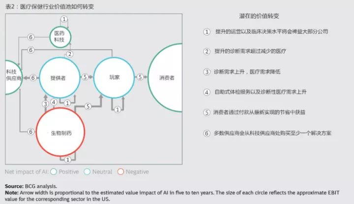 表2展示了一个潜在的场景,说明随着人工智能的采用,整个医疗保健价值池可能会发生怎样的变化。当然,各个行业的玩家的价值增长点变化会有所不同,每个行业都有赢家和输家。最初,大多数公司都会从AI公司的内部运作过程中获益(图2中标记为1的箭头)。受益于研发效率、个性化营销和合理化精简的支持功能,生物制药公司和支付者很可能从这些努力中获益最多。
