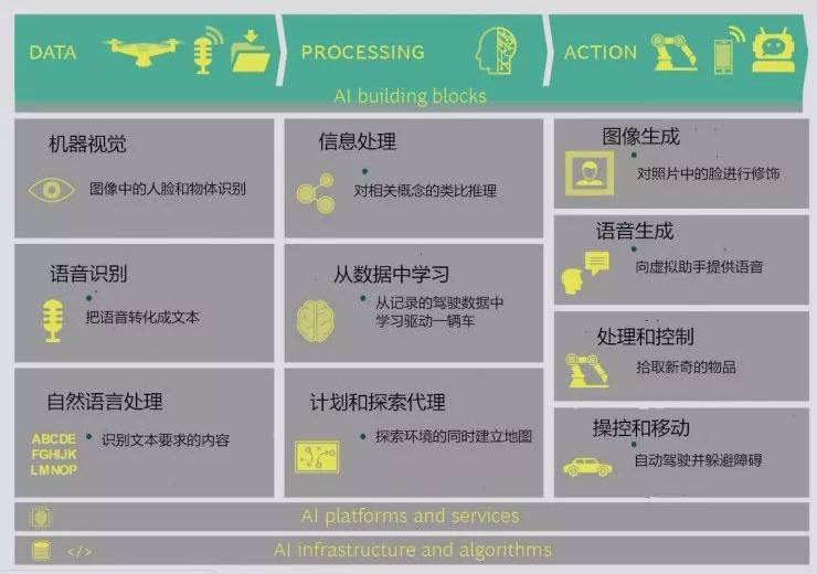 企业也可以访问我们所说的人工智能构造块。这些构造块,如机器视觉,比裸算法更实用,但并不是完全自主操作的。人工智能的每一个用途都依赖于一个或多个构建块,每个构造快都依赖于算法、API和预先训练的数据集。在研究和经验的基础上,我们确定了10个正在快速发展的建筑板块。管理人员需要了解这些构造块的功能和潜在价值。有些事情在今天艰难但可行,未来几年内可能变得很容易,而今天不可能的事在三到五年内也可能会得到实现。