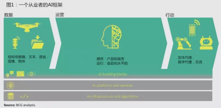将人工智能应用于工作的概念框架相当直观。(见下表所示)简而言之,人工智能算法吸收数据,处理数据,然后生成动作。然而,这一过程依赖于几个技术层面的适当整合,且确定从数据到行动的具体路径,往往会对企业造成困扰。