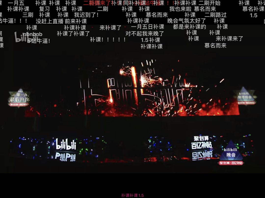 “补课”是《bilibili晚会 二零一九最美的夜》这个视频中,观众在前两分钟刷得最多的弹幕,寓意着观众是在元旦之后回来补看跨年晚会。