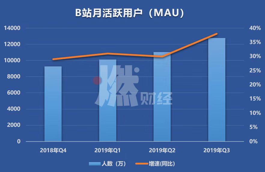 B站11月公布的第三季度财报中,最为亮眼的还是B站持续快速扩大的用户规模,其Q3的平均每月活跃用户数(MAU)已达1.279亿,同比增长38%,环比净增1750万,是公司历史上净增数最多的一个季度。