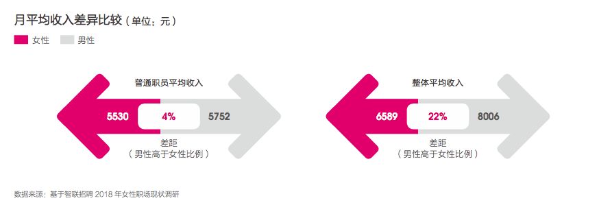 这份名为《2018中国女性职场现状调研报告》基于对全国31个省市102415份样本的分析显示,女性普通职员的平均月收入为5530元,男性普通职员的平均月收入为5752元,两者的差距只有4%。整体平均收入上女性为6589元,男性为8006元,两者差距为22%。