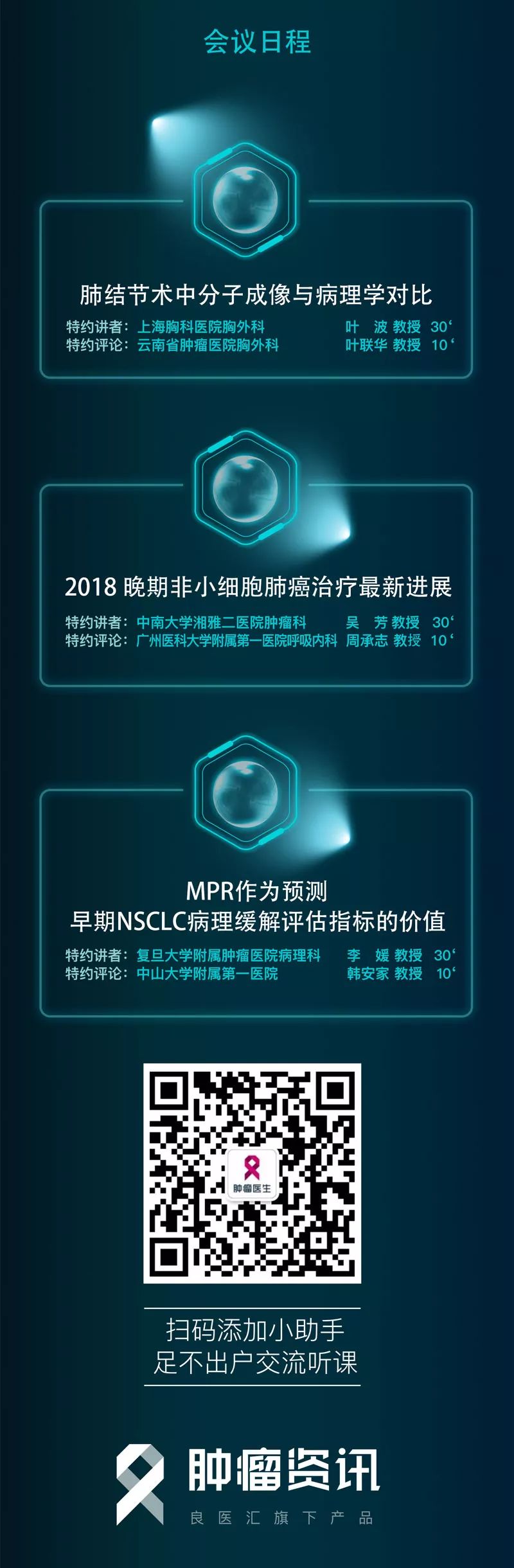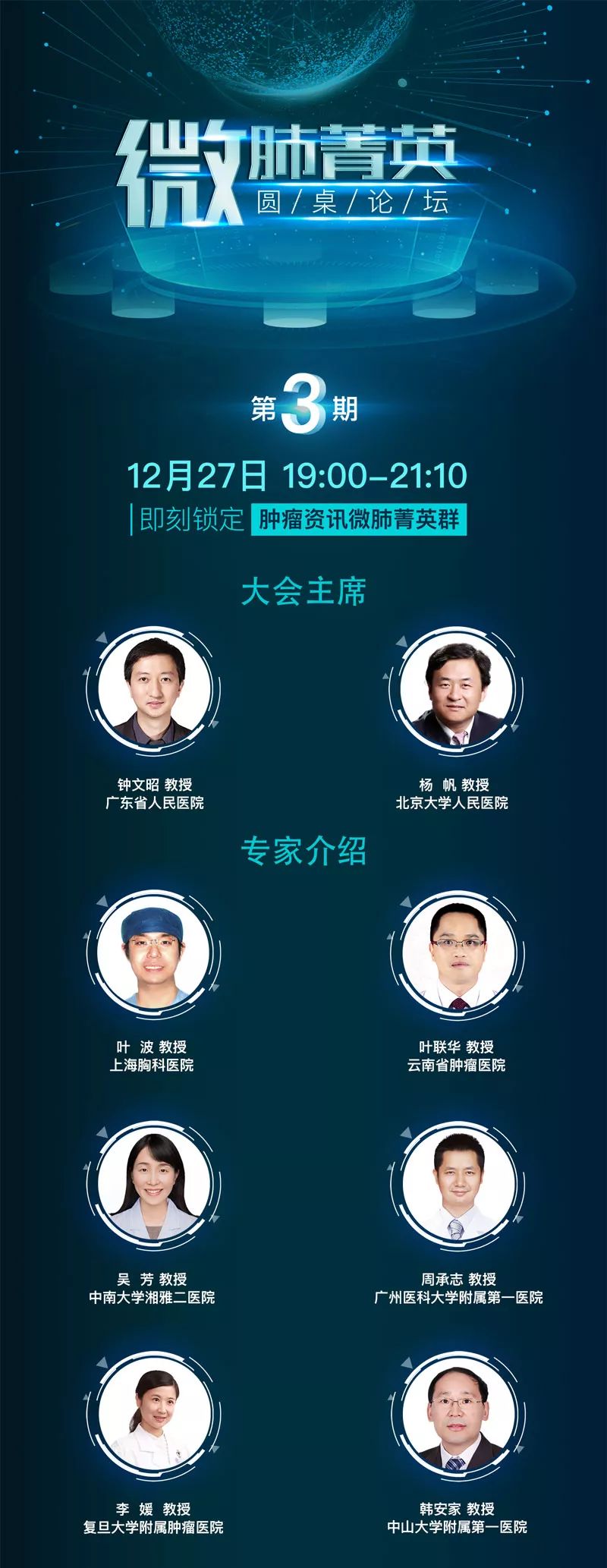 来自广东省人民医院的钟文昭教授和北京大学人民医院杨帆教授两位主席共同主持本次会议。上海胸科医院叶波教授、云南省肿瘤医院叶联华教授、中南大学湘雅二医院吴芳教授、广州医科大学附属第一医院周承志教授、复旦大学附属肿瘤医院李媛教授、中山大学附属第一医院韩安家教授和您相约《微肺菁英圆桌论坛》!