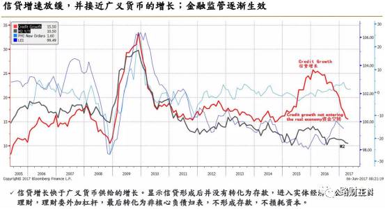 第一幅图,是过去10多年之间中国的信贷(Credit)增长率、广义货币供应量(M2)的增长率、采购经理人指数(PMI)和领先经济指标(LEI)的变动情况。