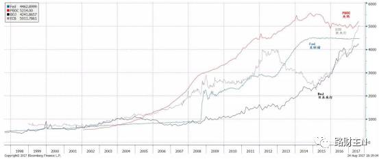 从趋势上看,日本和欧洲的央行资产负债表规模仍在快速扩张期,但是美联储和中国央行的资产负债表在2014-2016年已经开始停滞不前。