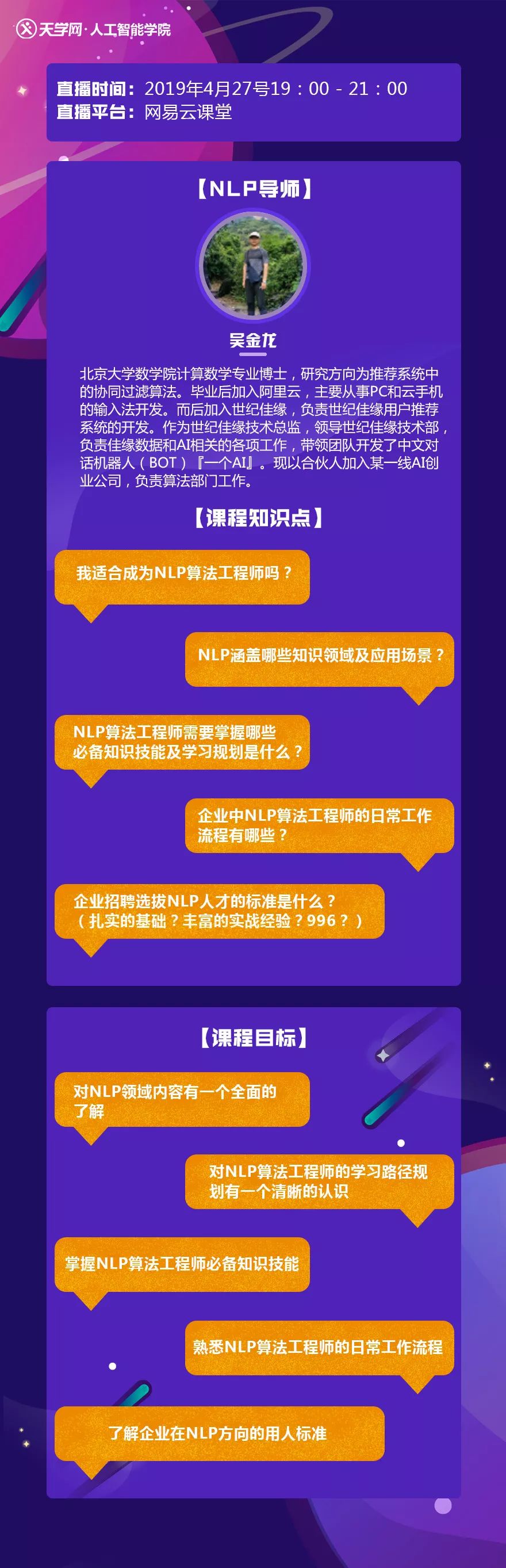此次,相信通过吴金龙导师长达两个小时的直播亲授,能帮你更好地理解NLP的学习与职场规划。