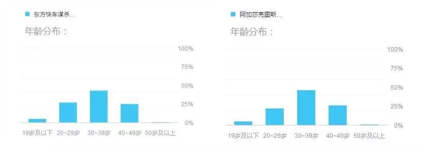 影片前期的宣传物料包含对经典角色特点、色彩浓厚的场景画面介绍,及导演与各个重量级主创的演技加持。宣传节奏和用力程度均较为符合影片的基调,请实力派明星参与配音的营销事件,满足原著小说读者的需求,符合影片的基本定位,经典的著作通常都是搭配一个经典的声音。从上映前期的百度指数来看,搜索阿加莎的人群年龄和电影《东方快车谋杀案》的人群年龄正好吻合。影片的主要目标人群为30岁及以上人群,因此也没有小鲜肉代言或是演绎主题曲等营销事件。
