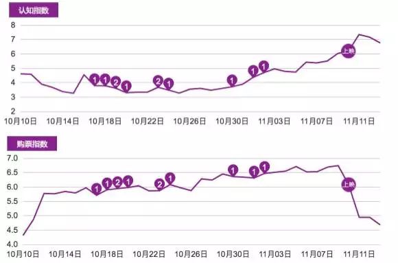 从影片的宣传营销来看,该片宣传期为40天左右,时长适中,最为密集的时间主要是映前的15天左右。从认知指数上看增势明显,增值最高的时间蹭上了“双十一”的节日热点。值得一提的是,该片在北美首映时,排名不及《雷神3:诸神黄昏》,在国内上映第二日后也被反超。但中国上映的首日,仍然以微弱优势夺得了票房冠军,一定程度上反映出前期宣传触达了目标人群。