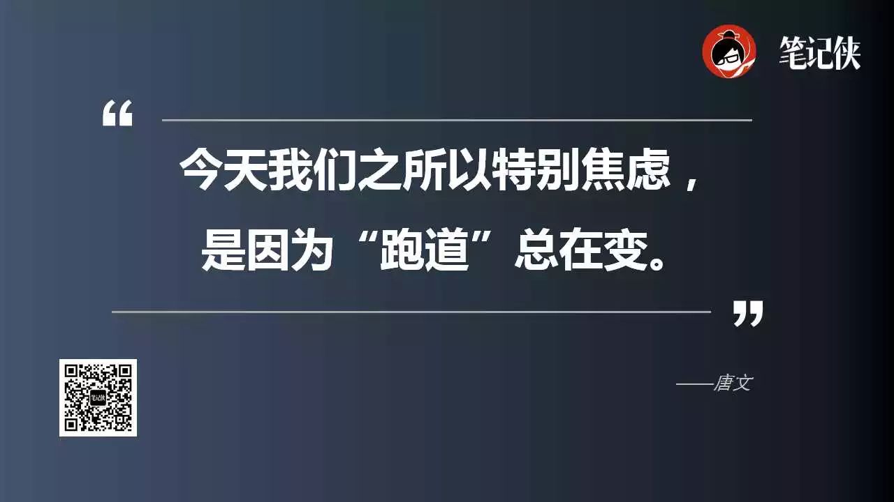 而今天我们之所以特别焦虑,是因为“跑道”总在变。每年我在全国要见大量的企业家,我能深刻感受到他们的焦虑。他们缺什么?他们有钱,有资源,有智慧,有经验。那他们还为什么还不安,还焦虑?就是来自于跑道总在变。