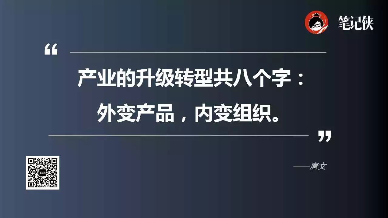 现在很多公司求变,但公司的变革是很难的。我总结起来,产业的升级转型共八个字:外变产品,内变组织。