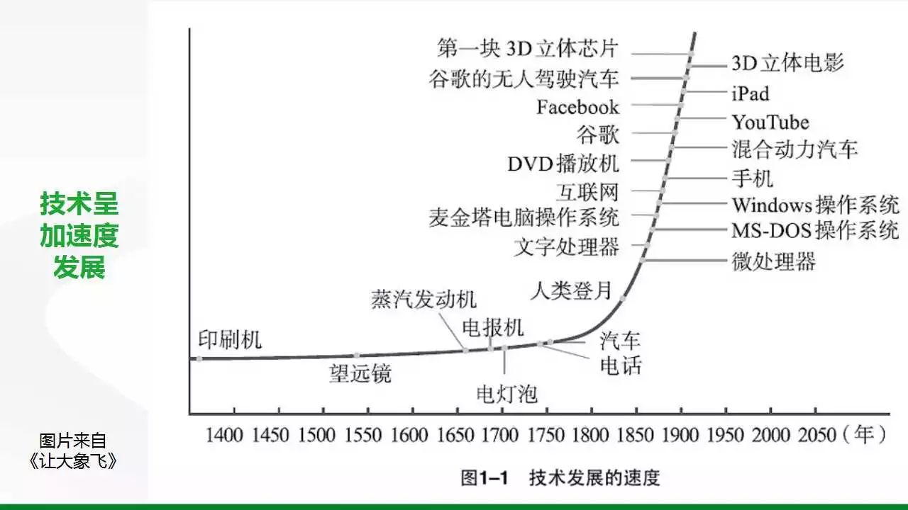 这张图展示的是技术发展的速度,大概是从1400年前,到我们现在这个时代,可以看到技术发展的速度呈现指数级增长。所谓指数级增长,即前期比较慢,但是只要过了一个拐点,就可以高速爆发增长。