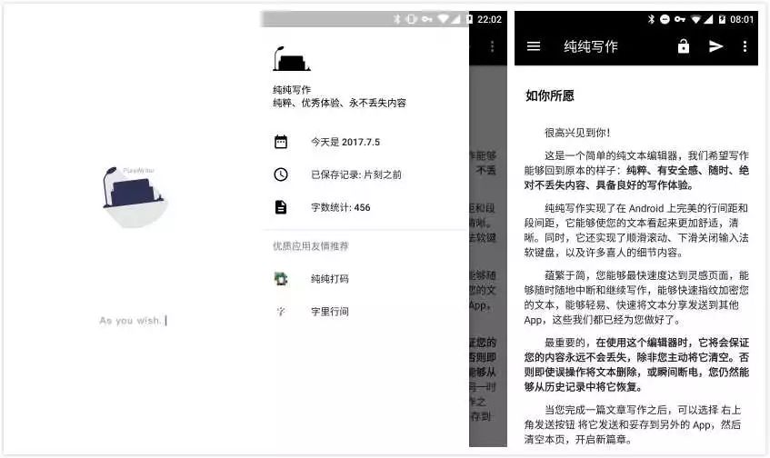 纯纯写作是一个很特殊的Android 笔记 App。