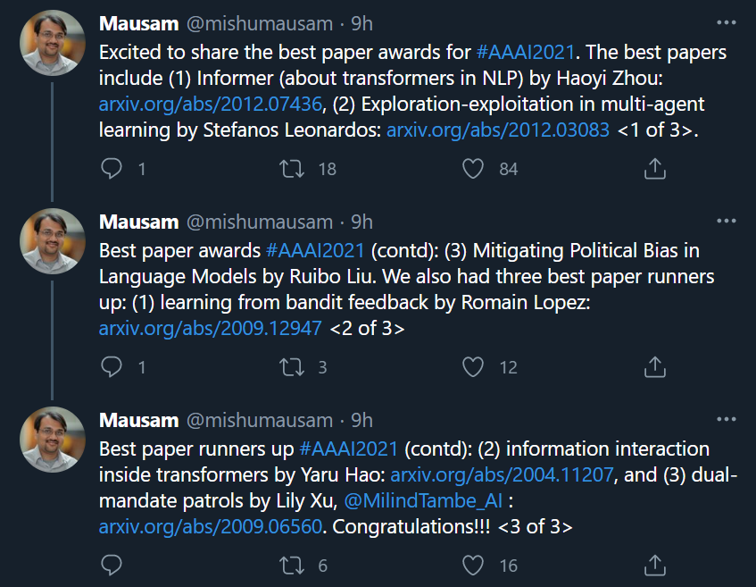 AAAI 2021程序委员会 Cochair Mausam公布论文奖项。