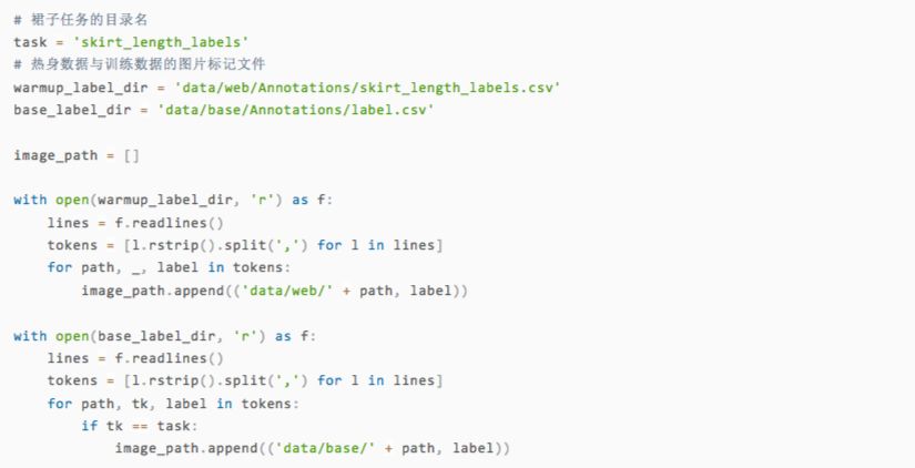 我们选用裙子数据的原因之一,就是热身数据与训练数据中都提供了它的训练图片,从而能让我们能够有更丰富的训练资源。下面我们将分别从热身数据欲训练数据的标记文件中: