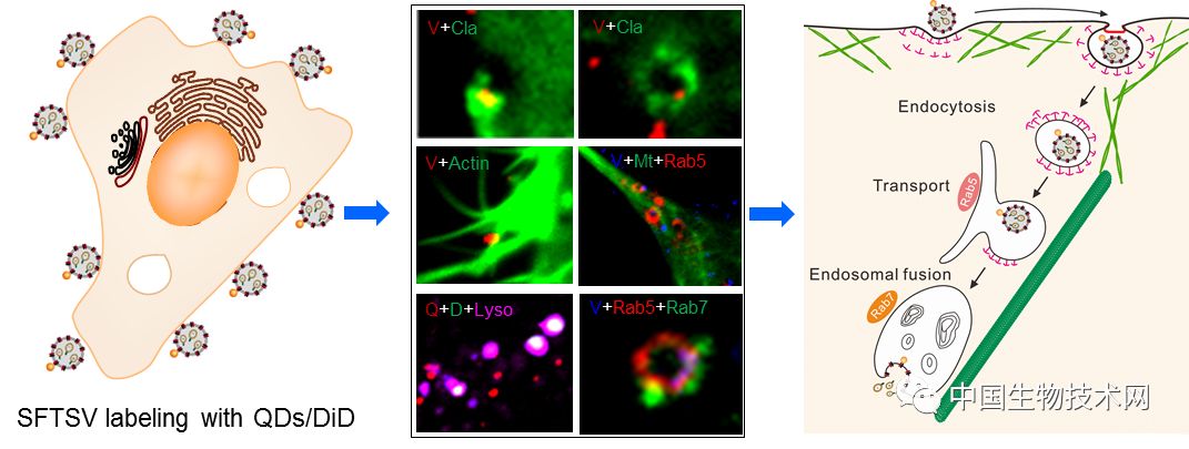 相关研究成果Single-Particle Tracking Reveals the Sequential Entry Process of the Bunyavirus Severe Fever with Thrombocytopenia Syndrome Virus 已经在Small 杂志上在线发表。华中科技大学博士后刘佳为该论文的第一作者,华中科技大学同济医学院教授周亦武和中科院武汉病毒所副研究员王曼丽为该论文的共同通讯作者。在项目研究过程中,获得了武汉大学教授庞代文团队的大力支持。该研究得到国家自然科学基金创新群体项目(31621061)和重点项目(21535005)、中央高校基本科研业务费专项资金(2016JCTD117)、病毒学国家重点实验室开放基金(2017IOV007)等的资助。