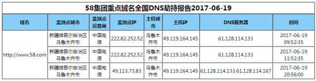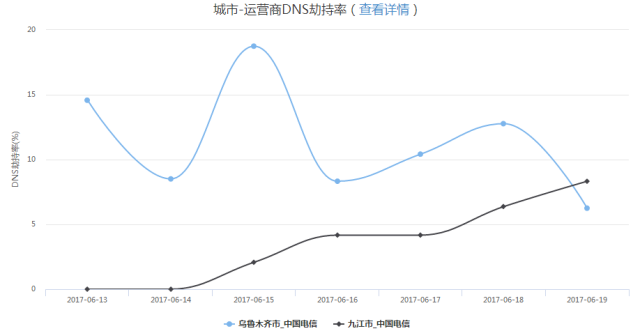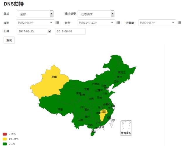 另外,还可以对 DNS 劫持、链路劫持、访问出错、访问速度较慢的问题进行告警,以 DNS 劫持数据的展示举例: